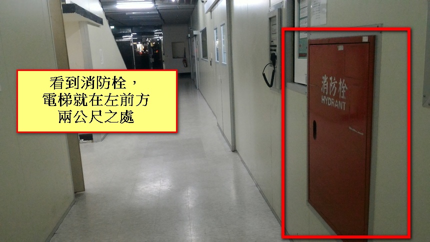 Step7. 如果你找不到電梯的話,它就在消防栓左前方兩公尺之處。你也可以隨手抓個路人學生來問(就問他光華樓306室在哪),或打電話0912-485-598跟我求救。